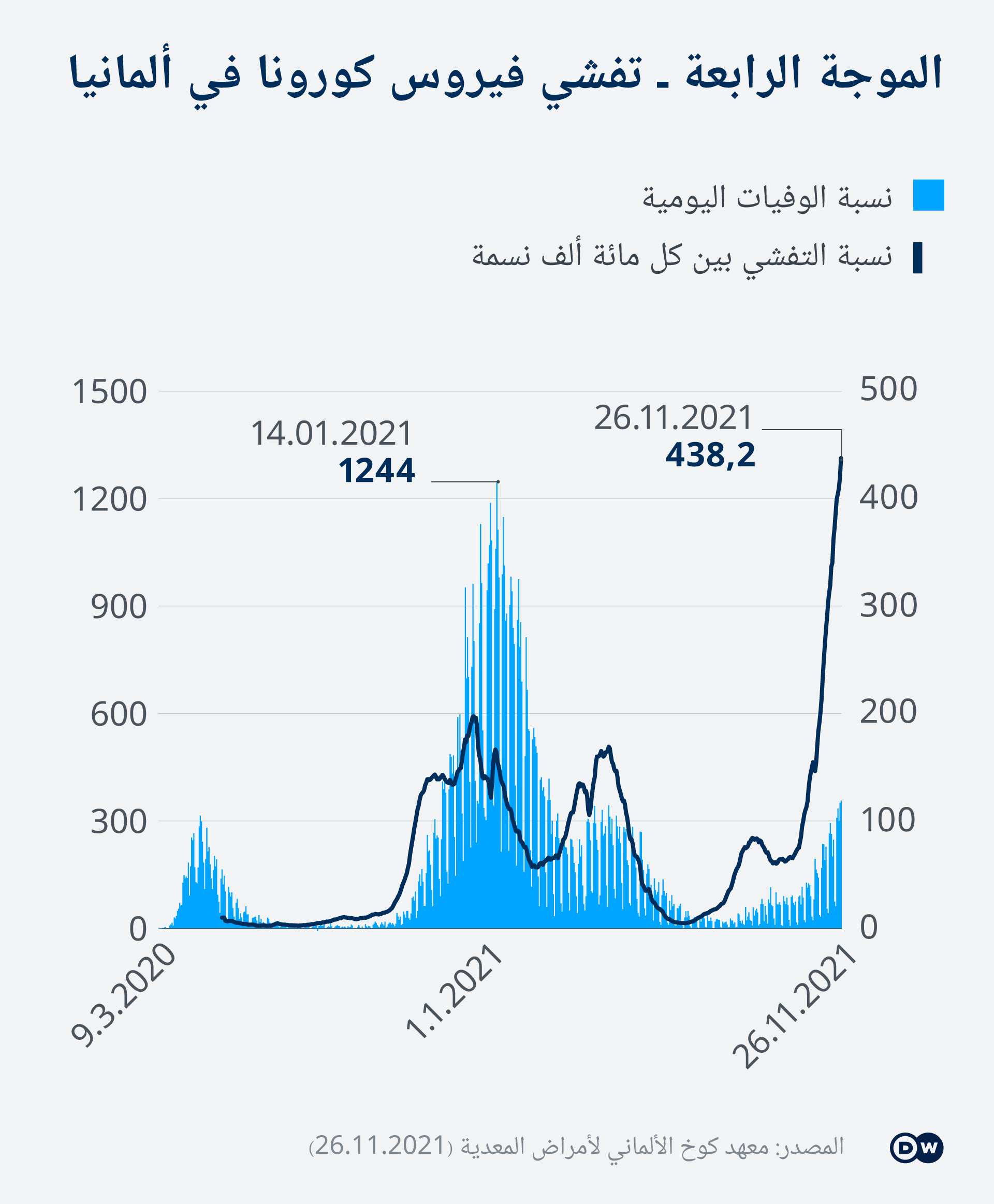 دعا العديد من الساسة الألمان البارزين إلى فرض قيود أكثر صرامة لاحتواء زيادة الإصابة بفيروس كورونا بعد وصول معدل الإصابة إلى مستوي قياسي جديد وتزايد المخاوف بشأن السلالة الجديدة أوميكرون.